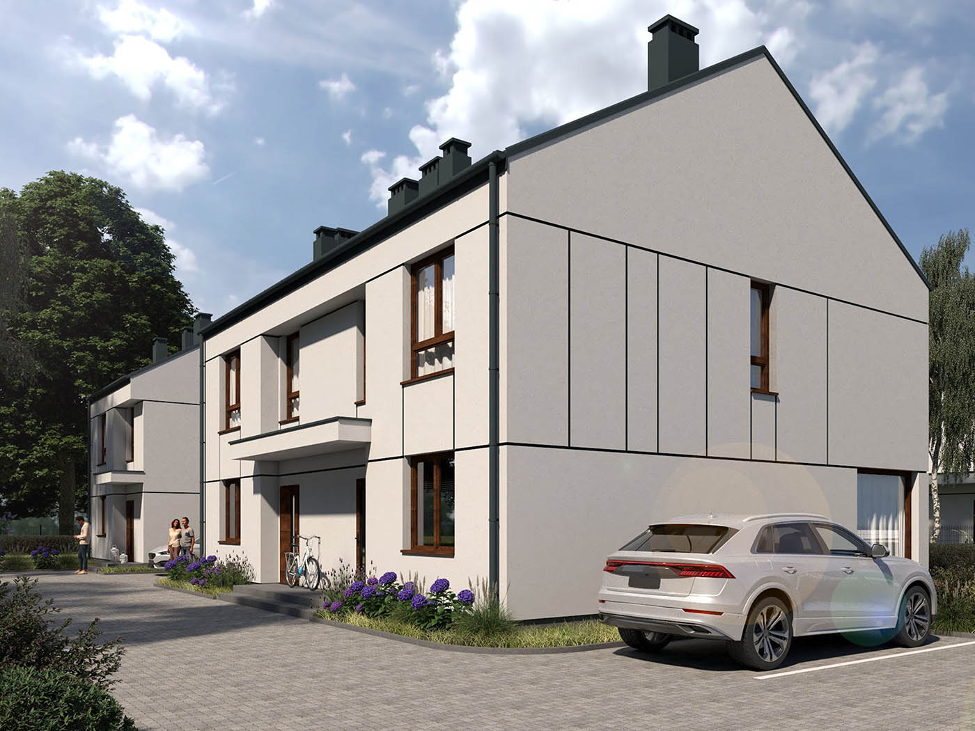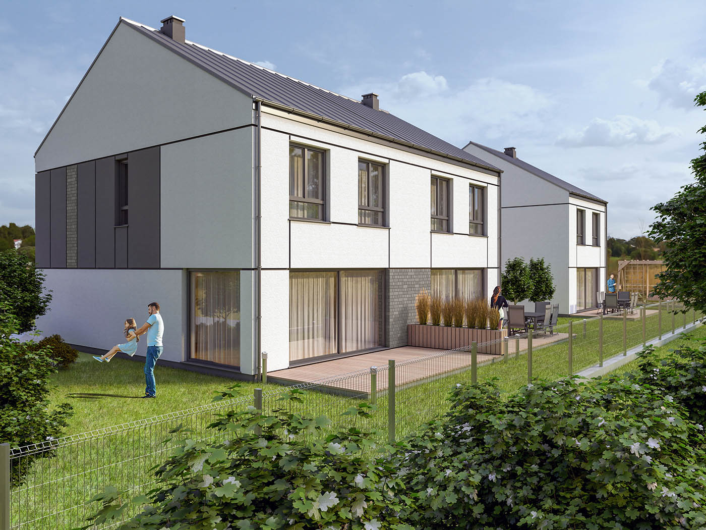 Budynki z dostępem do prywatnego ogrodu oraz przestronnego tarasu, podwójne miejsca parkingowe.